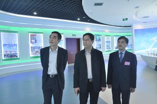 圖為中國醫(yī)藥企業(yè)管理協(xié)會會長郭云沛(左一)一行參觀我公司展廳時(shí)的情景