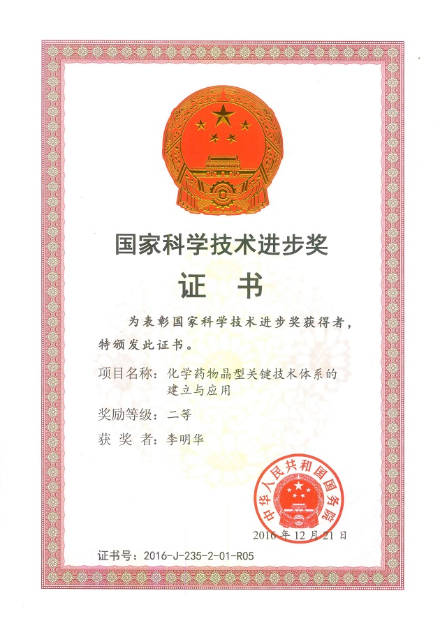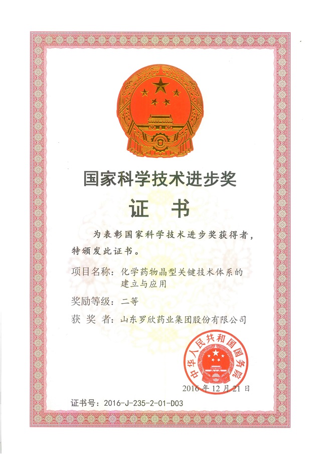 2017年1月9日,國家科學(xué)技術(shù)獎勵大會在北京人民大會堂隆重舉行。由中國醫(yī)學(xué)科學(xué)院藥物研究所、山東羅欣藥業(yè)集團(tuán)股份有限公司等單位聯(lián)合完成的“化學(xué)藥物晶型關(guān)鍵技術(shù)體系的建立與應(yīng)用”項(xiàng)目榮獲國家科技進(jìn)步獎二等獎。本項(xiàng)目實(shí)現(xiàn)了山東羅欣藥業(yè)在國家科技獎上的重大突破。