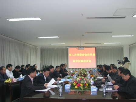 上圖為駐臨沂市全國、省、市人大代表會前集中視察人員在公司管理中心三樓會議室座談時的情景