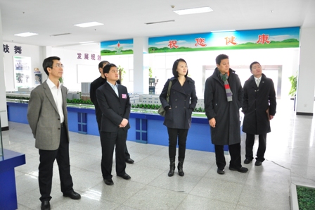 上圖為北京惠旭金石投資公司楊晨董事(右三)一行參觀公司展廳時(shí)的情景,市食品藥品監(jiān)督管理局催增久局長(zhǎng)(左一)陪同