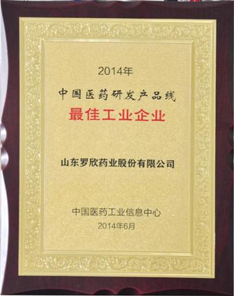 上圖為“2014年中國醫藥研發產品線最佳工業企業”榮譽證書